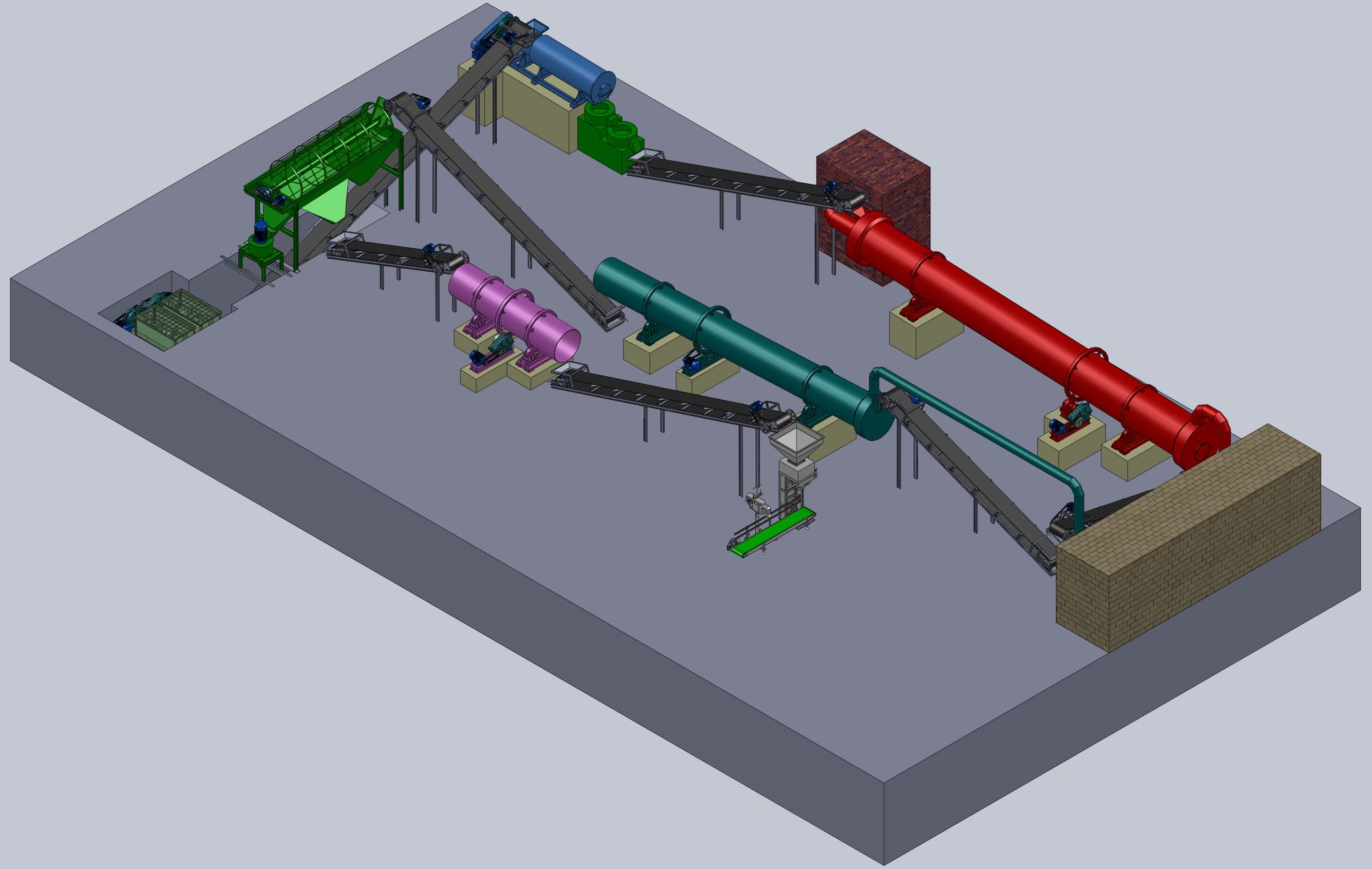 使用配料倉將堆肥后的物料和n、p、k等無機肥料及其他添加物等原料,按一定比例通過物料粉碎機和臥式混合機,進行粉碎、配比和混合。本系統作用是將堆肥后的物料和氮磷鉀無機肥料及其他添加物等各種原料按一定比例進行粉碎、配比和混合。根據多年經驗,設備配套建議如下:采用立式粉碎機粉碎牛糞堆肥物不易粘壁,不易堵塞,多層紊流鏈錘結構改善粉碎性能;采用連續式自動配料系統適合有機肥原料的動態計量及配料控制;混合作業配置雙軸連續式混合機,密封性好,粘濕物料不易在攪拌軸根部粘附。10萬噸粉狀有機肥生產線,5萬噸粉狀有機肥生產線,1萬噸粉狀有機肥生產線